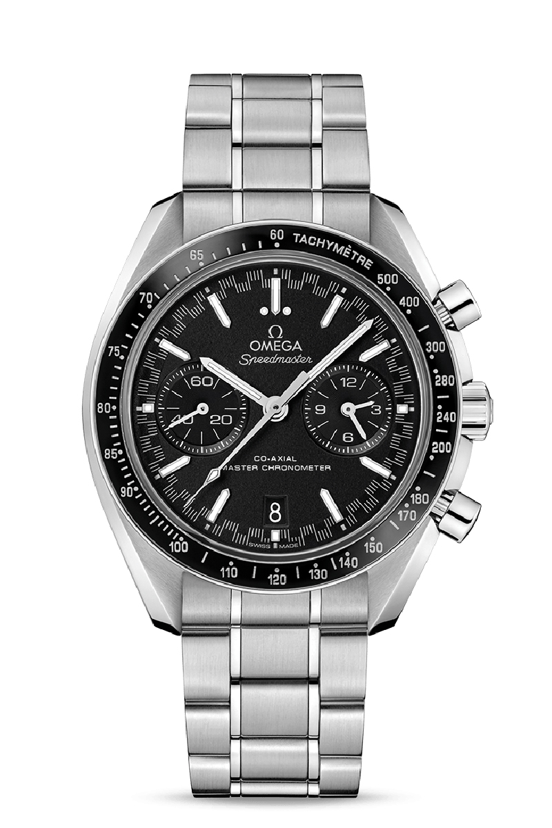 Este modelo Speedmaster Racing Master Chronometer, con brazalete en acero noble, luce caja de 44,25 mm, también en acero noble, con un aro de bisel en cerámica negra que incluye la famosa escala de taquímetro, en Liquidmetal™ En la esfera negra, hay una distintiva escala de minutos en estilo "racing" que da al reloj su nombre. Hay también dos subesferas con anillos ennegrecidos y aplicados y, a las 6, una ventana de fecha que armoniza con el color de la esfera. Las agujas horarias están rodiadas y los índices en punta de flecha son de oro blanco de 18 qt con Super-LumiNova blanco. El reloj incorpora el calibre OMEGA Co-Axial Master Chronometer 9900 y cuenta con certificado del máximo nivel en el sector, otorgado por el METAS.