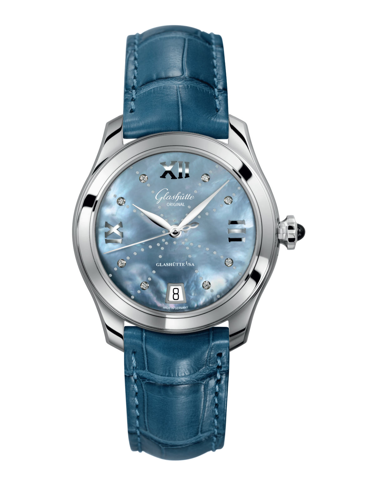 Material Cristal de zafiro. Esfera azul con índices en diamantes y números romanos en oro blanco.
