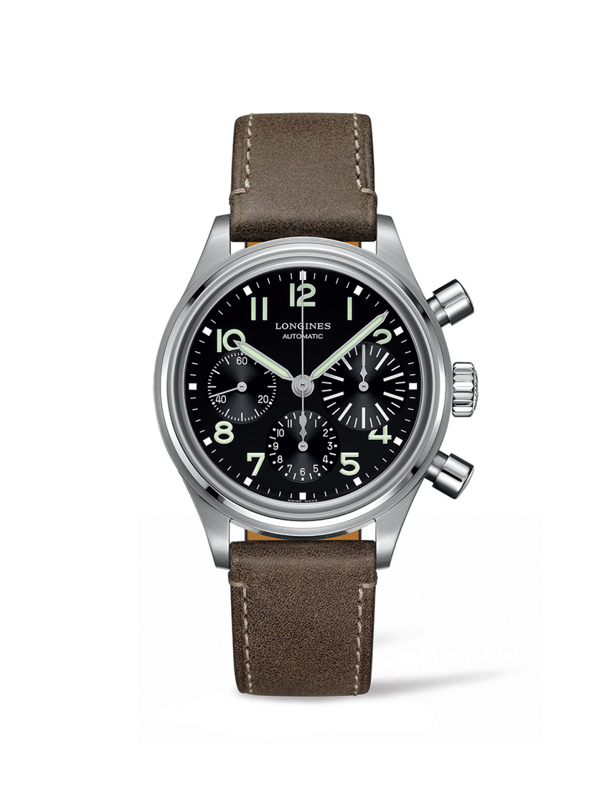 Funciones Horas, minutos y segundero pequeño a las 9. Cronógrafo de rueda de pilares. Mecanismo cronógrafo: segundero central del cronógrafo, contador de 30 minutos a las 3 y contador de 12 horas a las 6.