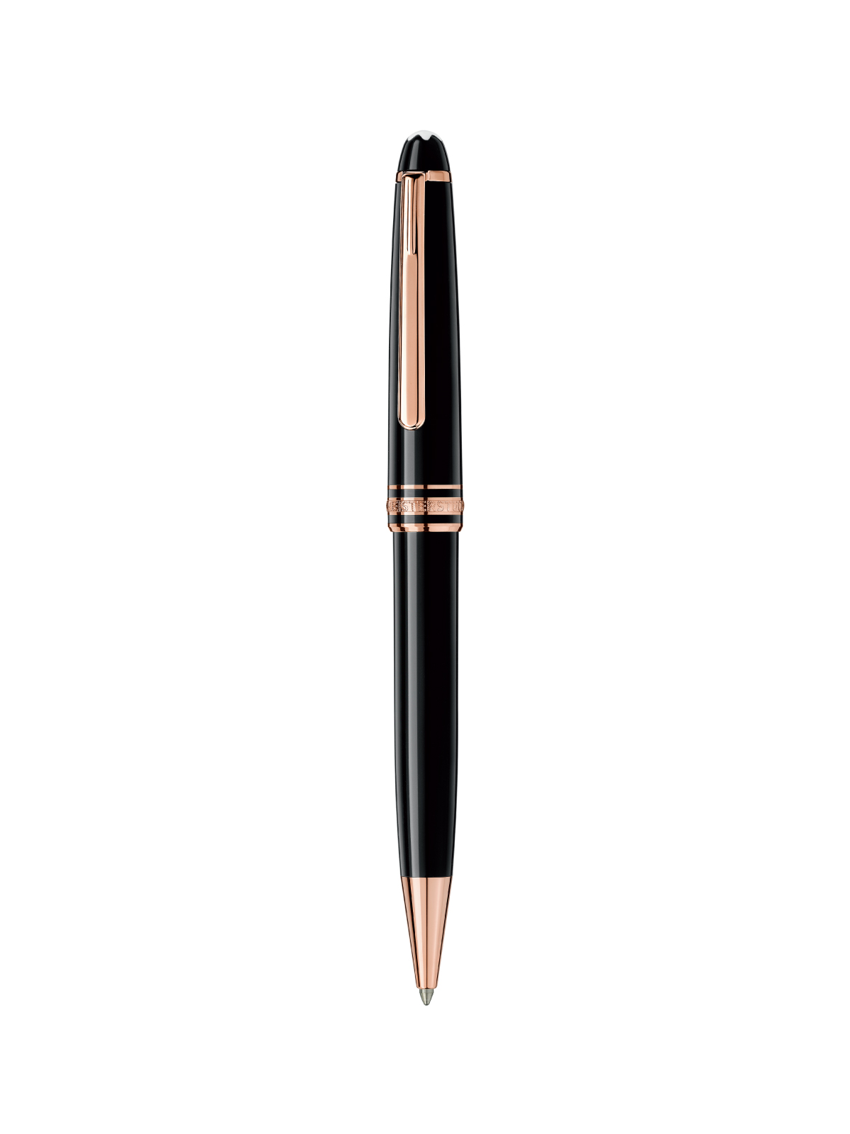 Material Esferógrafo. Resina preciosa negra con clip chapado en oro rojo, tres deslumbrantes anillos chapados en oro rojo con la marca Montblanc repujada y el emblema.