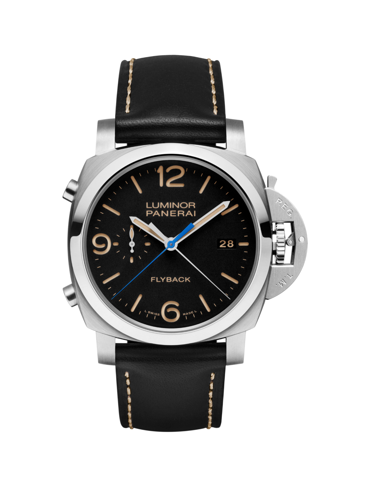 OFFICINE PANERAI PRESENTA EL LUMINOR 1950 3 DAYS CHRONO FLYBACK, un nuevo cronógrafo equipado con la función flyback y un movimiento automático con una reserva de marcha de tres días. El nuevo cronógrafo en acero es el primero fabricado por Officine Panerai con el nuevo calibre P.9100, íntegramente desarrollado y producido en la Manufactura de Panerai de Neuchâtel. La función flyback, controlada m