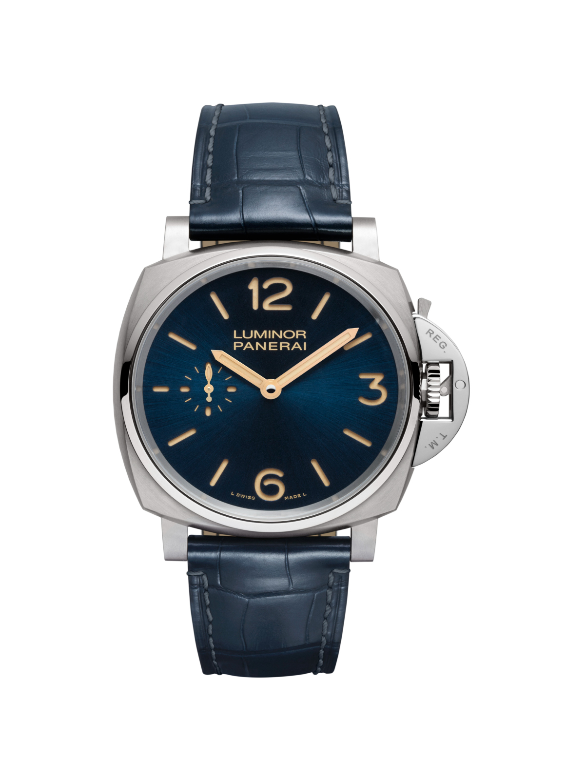 Material Cristal de zafiro hecho de corindón. Fondo Cristal de zafiro transparente. Dispositivo protector de la corona Titanio (patente registrada) Esfera Azul con acabado satinado soleil, números arábigos e índices horarios luminiscentes.