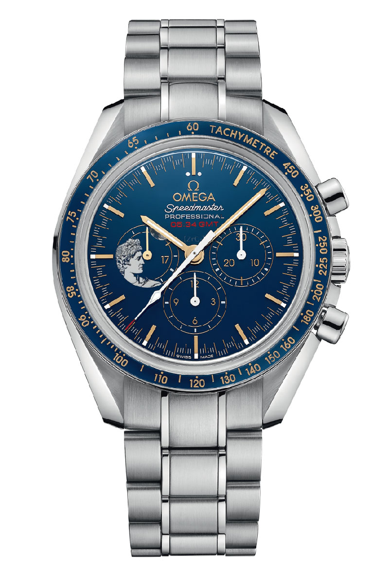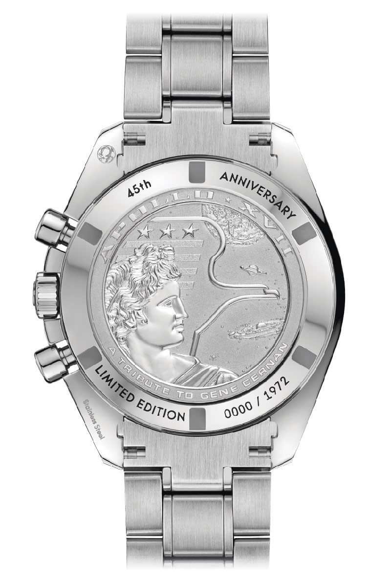 El reloj luce un brazalete de acero noble e incorpora el emblemático calibre OMEGA 1861. El fondo de caja lleva grabados "45th ANNIVERSARY", "Limited Edition" y un número exclusivo. Tiene también grabado en relieve un escudo Apolo XVII, "APOLLO XVII" y "a tribute to Gene Cernan". Cinco años de garantía.