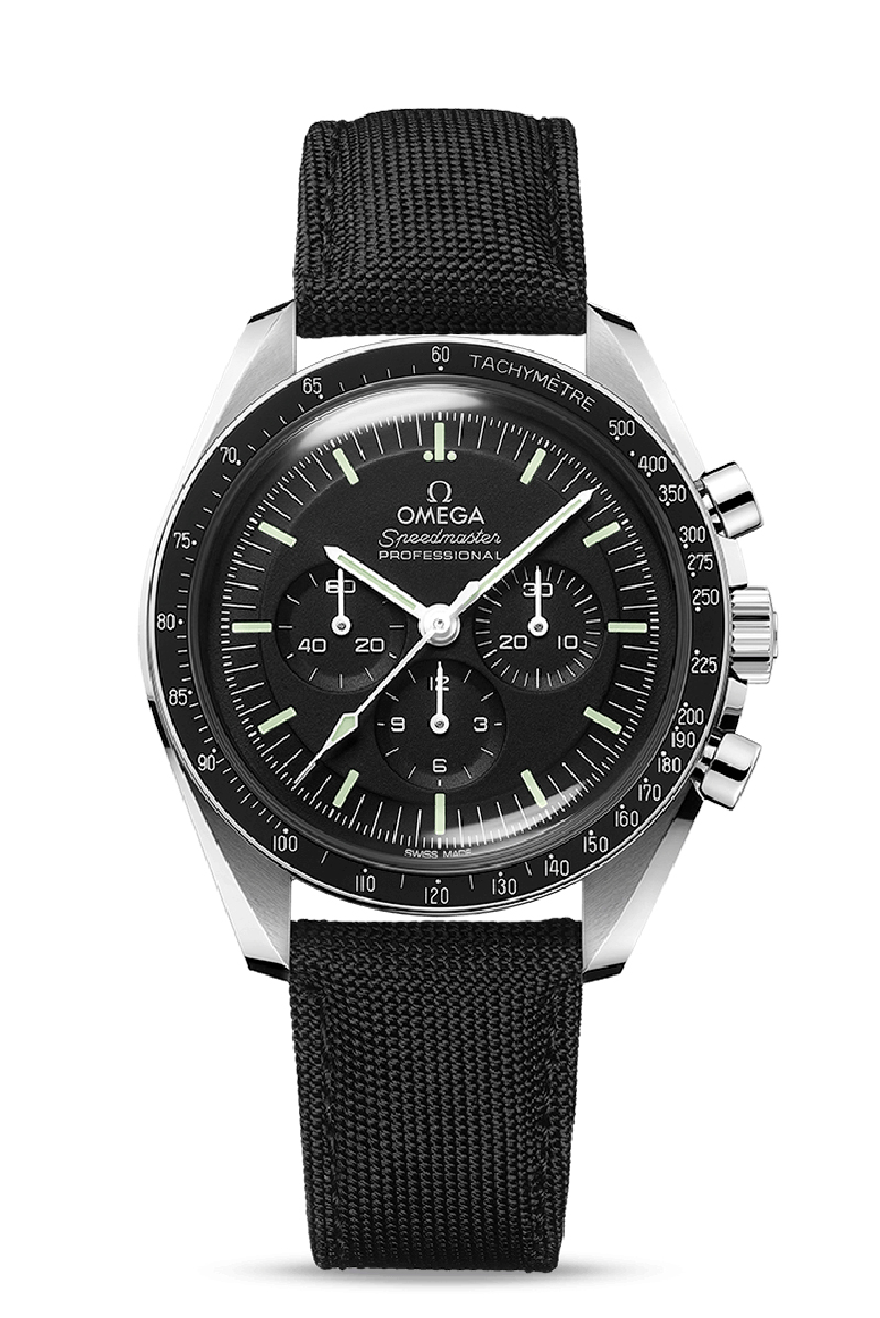 El Speedmaster Moonwatch es uno de los relojes más emblemáticos del mundo. Como parte integrante de las seis misiones lunares, el legendario cronógrafo constituye una impresionante representación del espíritu pionero y aventurero de la firma. Con pulsera de tejido de nailon, este Moonwatch de 42 mm en acero noble luce en el frente un cristal hesalite y un medallón del Hipocampo grabado en relieve en el fondo de caja. Inspirado en la cuarta generación del estilo Speedmaster utilizado en la Luna, también incluye una caja asimétrica, esfera negra achaflanada y el famoso círculo sobre el 90 del aro de bisel en aluminio anodizado. El reloj incorpora el OMEGA Co-Axial Master Chronometer calibre 3861, que activa el pequeño segundero de la subesfera, los contadores de 30 minutos y de 12 horas y la función de cronógrafo central.
