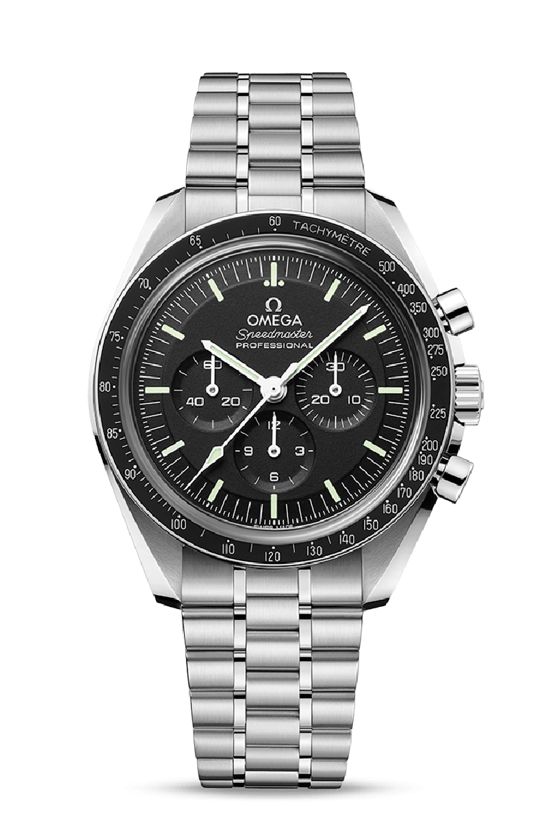 El Speedmaster Moonwatch es uno de los relojes más emblemáticos del mundo. Como parte integrante de las seis misiones lunares, el legendario cronógrafo constituye una impresionante representación del espíritu pionero y aventurero de la firma. Con brazalete de cinco eslabones convexos por fila, cepillados y pulidos, este Moonwatch de 42 mm en acero noble luce en el frente un cristal de zafiro y también en el fondo de caja. Inspirado en la cuarta generación del estilo Speedmaster utilizado en la Luna, también incluye una caja asimétrica, esfera negra achaflanada con logotipo OMEGA en aplique y el famoso círculo sobre el 90 del aro de bisel en aluminio anodizado. El reloj incorpora el OMEGA Co-Axial Master Chronometer calibre 3861, que activa el pequeño segundero de la subesfera, los contadores de 30 minutos y de 12 horas y la función de cronógrafo central.