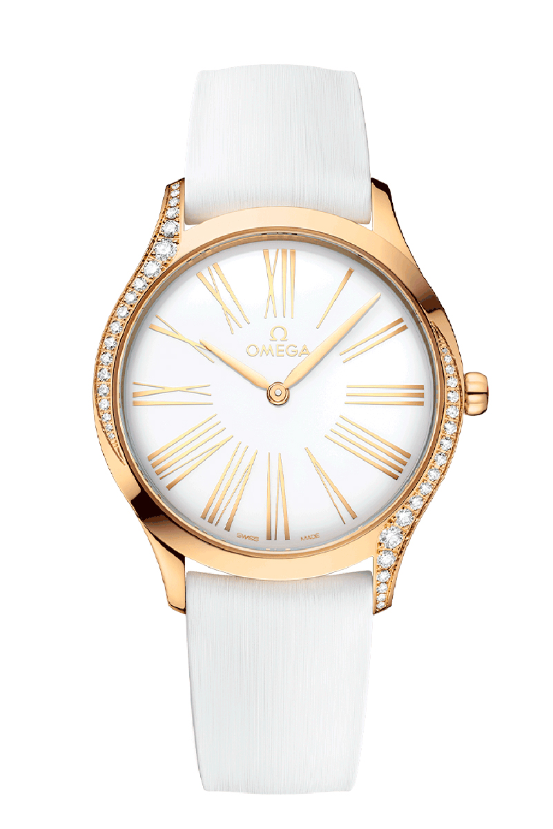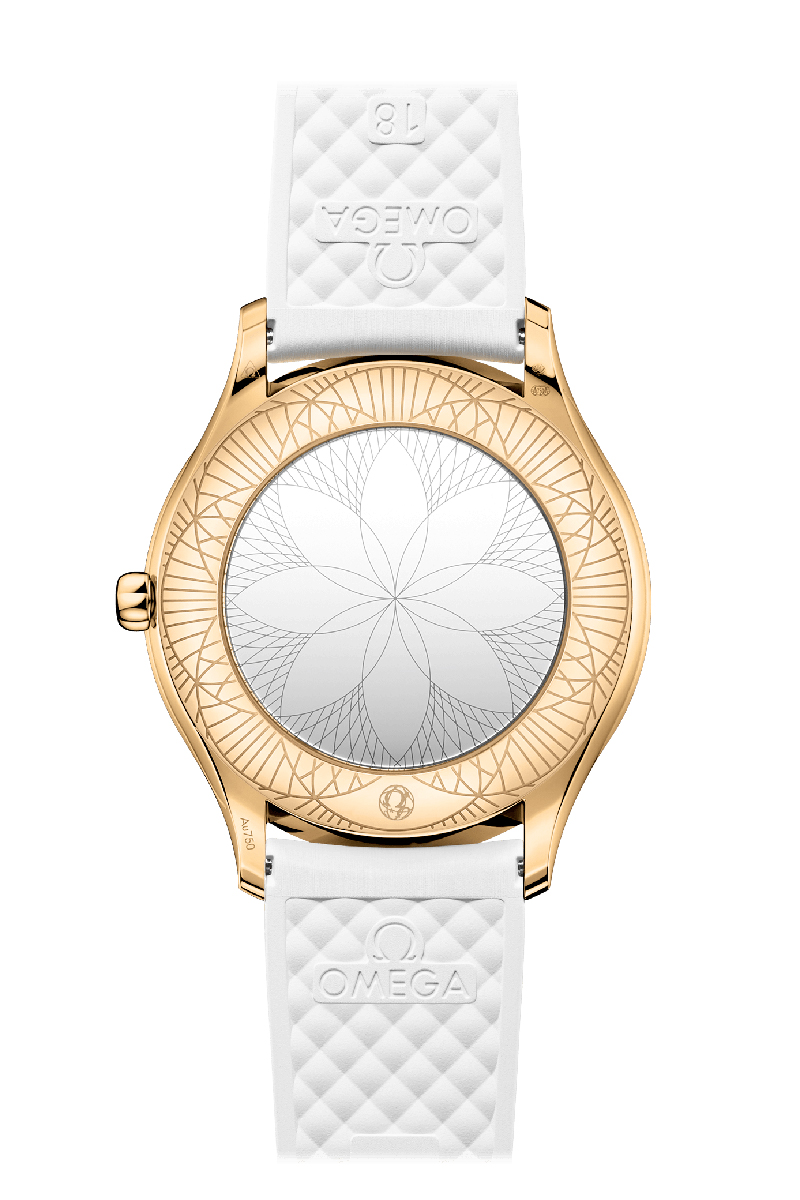 OMEGA tiene una larga tradición como creadora de maravillosos relojes femeninos. En esta colección Trésor actual, cada reloj ha sido realizado con un diseño depurado y un estilo realmente moderno. Para este modelo, la delgada caja de 36 mm se ha realizado en oro Moonshine™ de 18 qt y luce 38 diamantes tallados en brillante, que se curvan con elegancia a lo largo de cada borde. La esfera blanca incluye números romanos grabados en relieve y agujas en oro Moonshine™ de 18 qt pulidas con diamante, mientras que la corona luce un solo diamante, esta vez rodeado por una flor en cerámica líquida compuesta por cinco logotipos OMEGA. Con pulsera de caucho blanco, el reloj incorpora el movimiento OMEGA calibre 4061, situado tras un fondo de caja pulido en espejo y embellecido por un motivo "Her Time" metalizado.