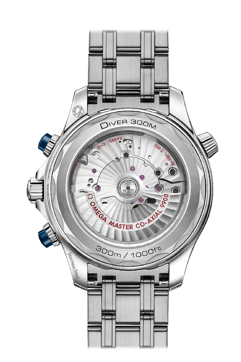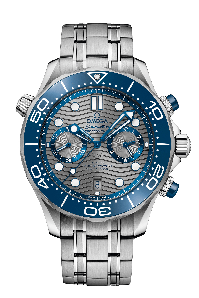 Desde 1993, el Seamaster Professional Diver 300M disfruta de una multitud de seguidores legendaria. La moderna colección de hoy ha adoptado el famoso patrimonio oceánico y lo ha actualizado con las innovaciones y el diseño más perfectos de OMEGA. Este cronógrafo de 44 mm está realizado en acero noble e incluye un bisel cerámico azul pulido, con escala de inmersión esmaltada en blanco. Los pulsadores son también de cerámica azul pulida, mientras que la esfera es de cerámica recubierta de PVD color cromo con cepillado solar y tiene ondas grabadas por láser y ventana de fecha a las 6. Las agujas de la subesfera están azuladas, junto con todas las demás agujas e índices, que están rellenos de Super-LumiNova blanco. El reloj se presenta con un brazalete en acero noble e incorpora el movimiento OMEGA Master Chronometer calibre 9900, visible a través del cristal de zafiro del fondo de caja con borde ondulado.