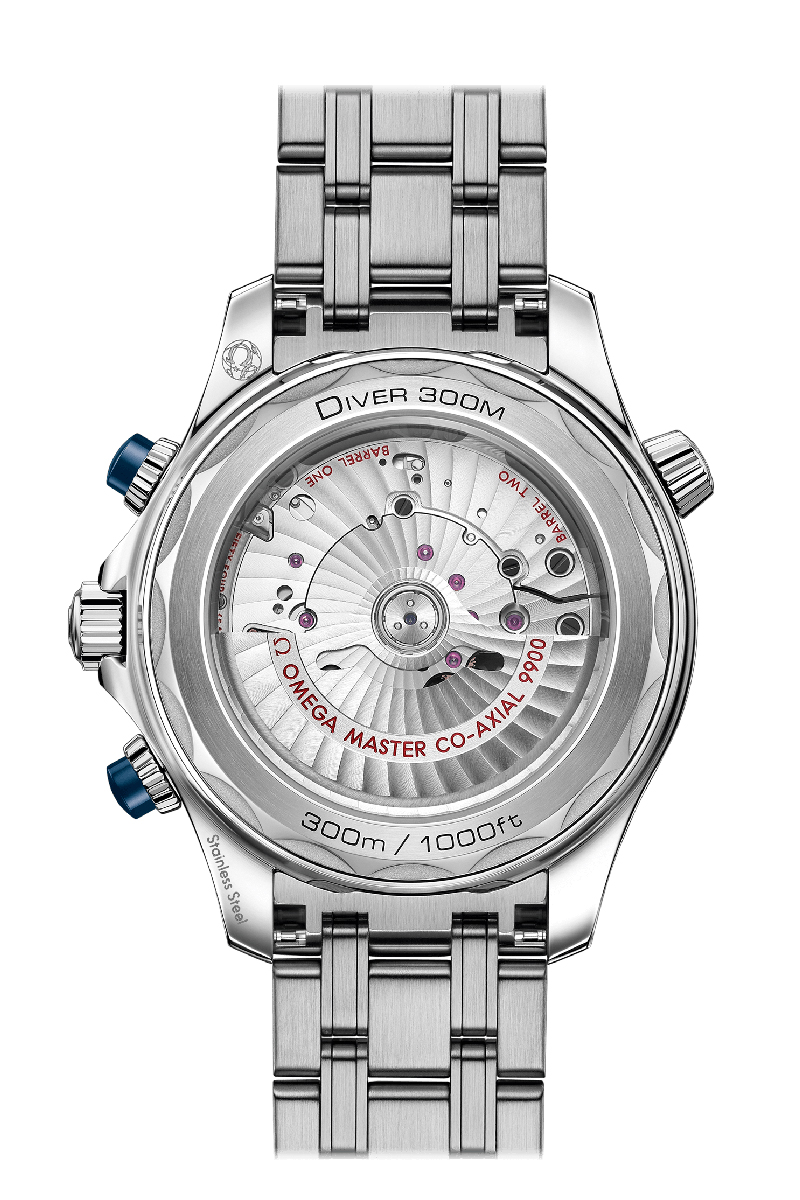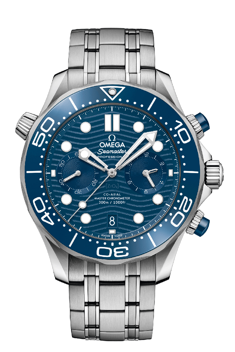 Desde 1993, el Seamaster Professional Diver 300M disfruta de una multitud de seguidores legendaria. La moderna colección de hoy ha adoptado el famoso patrimonio oceánico y lo ha actualizado con las innovaciones y el diseño más perfectos de OMEGA. Este cronógrafo de 44 mm está realizado en acero noble e incluye un bisel cerámico azul pulido, con escala de inmersión esmaltada en blanco. Los pulsadores son también de cerámica azul pulida, igual que la esfera, que luce unas ondas grabadas por láser y una ventana de fecha situada a las 6. Las agujas de la subesfera están rodiadas, junto con todas las demás agujas e índices, que están rellenos de Super-LumiNova blanco. El reloj se presenta con un brazalete en acero noble e incorpora el movimiento OMEGA Master Chronometer calibre 9900, visible a través del cristal de zafiro del fondo de caja con borde ondulado.