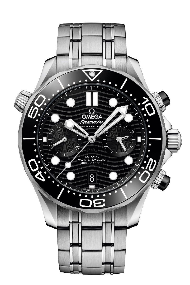 Desde 1993, el Seamaster Professional Diver 300M disfruta de una multitud de seguidores legendaria. La moderna colección de hoy ha adoptado el famoso patrimonio oceánico y lo ha actualizado con las innovaciones y el diseño más perfectos de OMEGA. Este cronógrafo de 44 mm está realizado en acero noble e incluye un bisel cerámico negro pulido, con escala de inmersión esmaltada en blanco. Los pulsadores son también de cerámica negra pulida, igual que la esfera, que luce unas ondas grabadas por láser y una ventana de fecha situada a las 6. Las agujas de la subesfera están rodiadas, junto con todas las demás agujas e índices, que están rellenos de Super-LumiNova blanco. El reloj se presenta con un brazalete en acero noble e incorpora el movimiento OMEGA Master Chronometer calibre 9900, visible a través del cristal de zafiro del fondo de caja con borde ondulado.