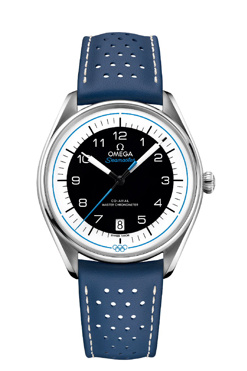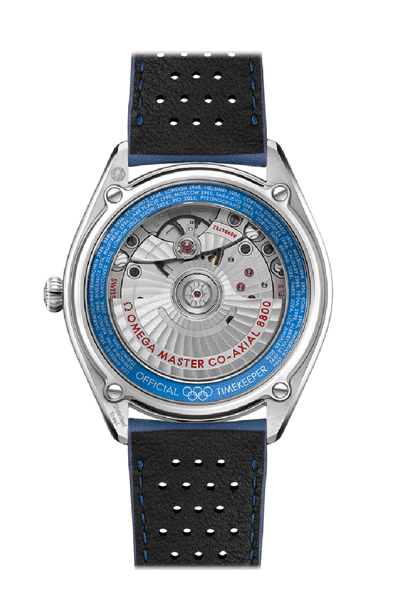 La colección Seamaster Olympic Games se inspira en los aros de los Juegos Olímpicos y el diseño de antiguos relojes de cronometraje de OMEGA. Este modelo de 39,5 mm tiene una caja de acero noble y una pulsera de piel azul microperforada. La esfera convexa blanca y negra incluye agujas deportivas, una ventana de fecha y una escala de minutos de lectura fácil, además de un pulsímetro azul que permite a quien lo lleva puesto calcular sus pulsaciones por minuto. En el fondo de caja, hay un aro azul de aluminio anodizado que incluye todas las ciudades anfitrionas conocidas y las fechas de las estancias de OMEGA en Juegos Olímpicos, de Los Ángeles 1932 hasta Los Ángeles 2028. El reloj incorpora el calibre Master Chronometer 8800. Solo se han creado 2032 ejemplares de este modelo, con el número de Edición Limitada grabado en el canto de la caja.