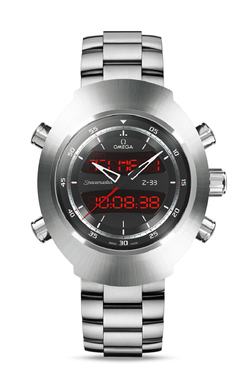 Este OMEGA Speedmaster Spacemaster Z-33 se inspira en la icónica forma de caja "Pilot Line" de la firma y está equipado con un nuevo y exclusivo movimiento multifunción en cuarzo, el calibre 5666. Flotando sobre la esfera digital, hay un juego de agujas de medición analógica, que se ajustan mediante la corona situada a las 3. Alrededor del reloj, hay cuatro pulsadores que, junto con la corona, permiten controlar totalmente el despliegue de funciones digitales. Esas funciones incluyen fecha, UTC y dos husos horarios, alarma y calendario perpetuo. El tiempo transcurrido se mide con una función de cronógrafo y un temporizador de cuenta atrás. Tiene también funciones de piloto profesional autoprogramables, para registrar hasta diez vuelos y visualizar esos registros con indicaciones de fecha y hora. La caja es de titanio de grado 5, con brazalete a juego.