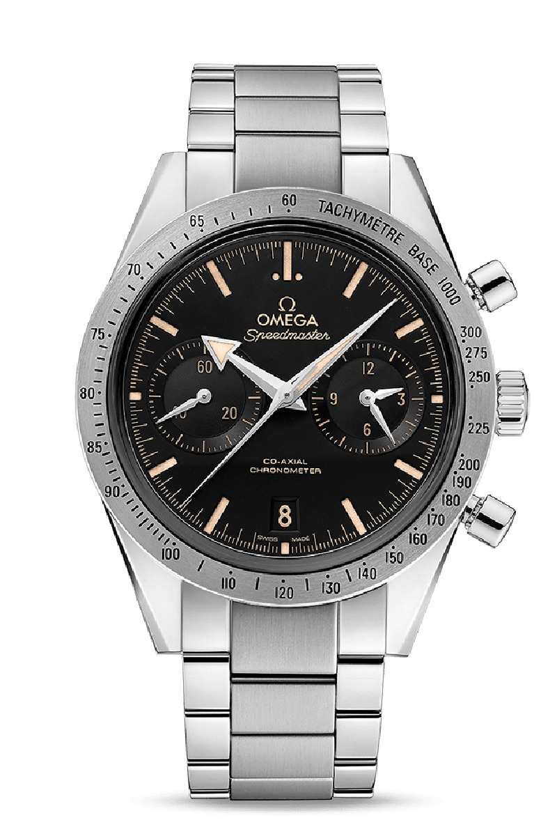 OMEGA Speedmaster es uno de los guardatiempos más icónicos de OMEGA. Participante en las seis misiones lunares, el legendario Speedmaster es una impresionante representación del audaz espíritu pionero de la firma. Este modelo, inspirado en su legendario predecesor, luce esfera negra con indicadores transferidos en beis. Tiene un pequeño segundero situado a las 9 y contadores de cronógrafo de 12 horas y de 60 minutos situados en la misma subesfera, a las 3. Los índices horarios están rebajados y parcialmente rellenos de Super-LumiNova, que emite luz verde. Las agujas horarias centrales, facetadas, rodiadas y pulidas, son de estilo “Broad Arrow” y están recubiertas con Super-LumiNova. La caja, de 41,5 mm y acero noble, se presenta con brazalete a juego. Este reloj incorpora el calibre OMEGA 9300 Co-Axial, el primer cronógrafo de la familia de movimientos mecánicos Co-Axial exclusivos de la firma y realizados totalmente en sus talleres.