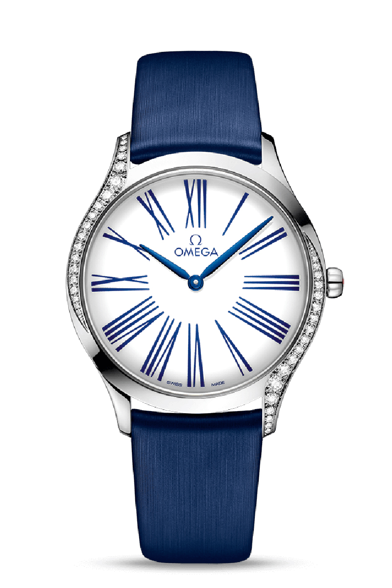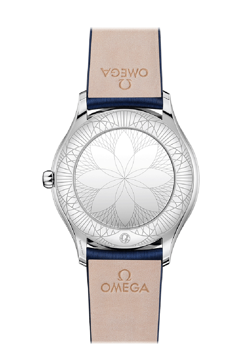 OMEGA tiene una larga tradición como creadora de maravillosos relojes femeninos. En esta colección actual, cada reloj ha sido realizado con un diseño depurado y un estilo realmente actual. La delgada caja de 36 mm es de acero noble y luce unas hileras de diamantes que cubren las curvas a lo largo de cada lado, además de una corona con un diamante engastado y pulida con "HyCeram" rojo. La esfera blanca lacada incluye unos números romanos azules transferidos exclusivos y unas elegantes agujas azuladas. El reloj incorpora el calibre OMEGA 4061, que se asienta tras un fondo de caja espejado especial, con un motivo “Her Time”. Se presenta con pulsera de tejido azul.