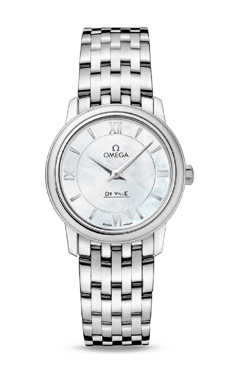 Por sus líneas clásicas y elegantes, la Colección OMEGA De Ville Prestige ha atraído a una fiel multitud de seguidores. Estos guardatiempos se caracterizan por un estilo sobrio, un lujoso acabado y un diseño intemporal. Este modelo presenta una esfera de nácar blanco en dos zonas, con número romanos a las 3, 6, 9 y 12 horas. Un cristal de zafiro resistente al rayado cubre esta asombrosa esfera. El bisel está montado en una caja de 27,4 mm y acero noble, con brazalete de acero noble. El reloj incorpora el calibre OMEGA 1376, un movimiento de precisión en cuarzo.