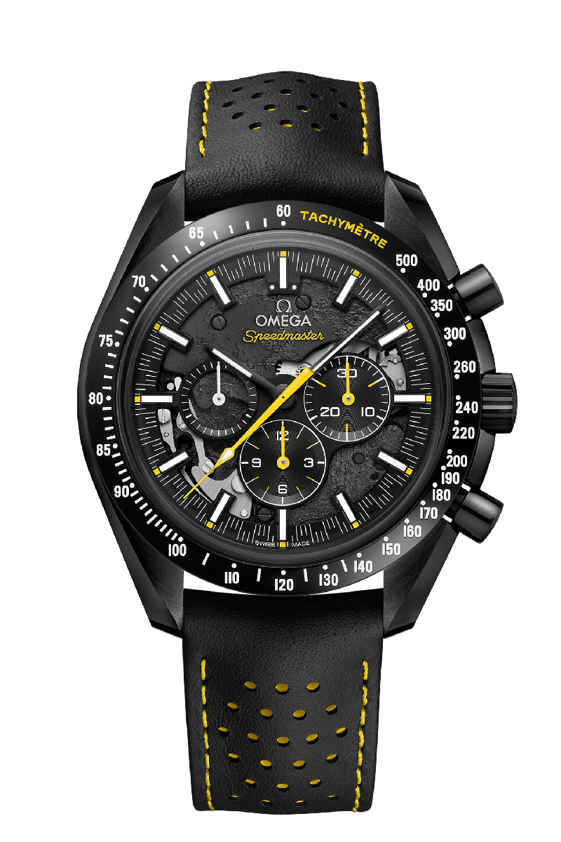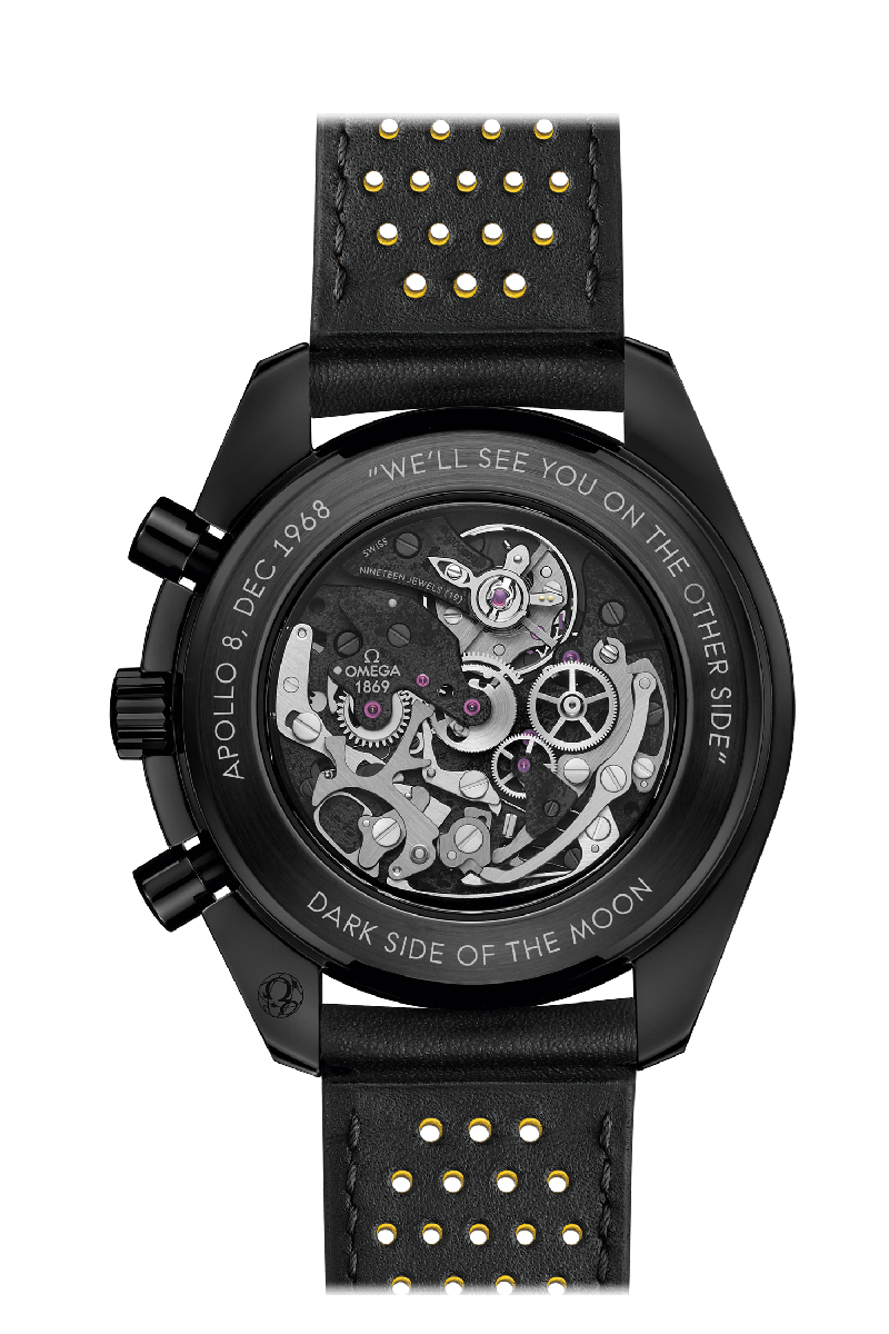 Como parte de los seis alunizajes históricos, el legendario OMEGA Speedmaster es un auténtico icono espacial y también del espíritu pionero de OMEGA. En este modelo de 44,25 mm, la historia lunar del Speedmaster se conmemora en el movimiento ennegrecido, que ha sido sometido a una ablación por láser para representar la superficie de la Luna. La cara visible se muestra a través de la esfera calada y ennegrecida; la cara oculta se ve a través del fondo de caja. Presentado con una pulsera de piel negra, perforada y con interior de caucho amarillo, todo el reloj es de cerámica negra e incluye agujas de cronógrafo amarillas barnizadas y una escala Super-LumiNova de taquímetro. El movimiento interior con decorado especial es el calibre OMEGA 1869, mientras que los grabados del fondo de caja incluyen "APOLLO 8, DEC 1968", "DARK SIDE OF THE MOON" y "WE’LL SEE YOU ON THE OTHER SIDE".
