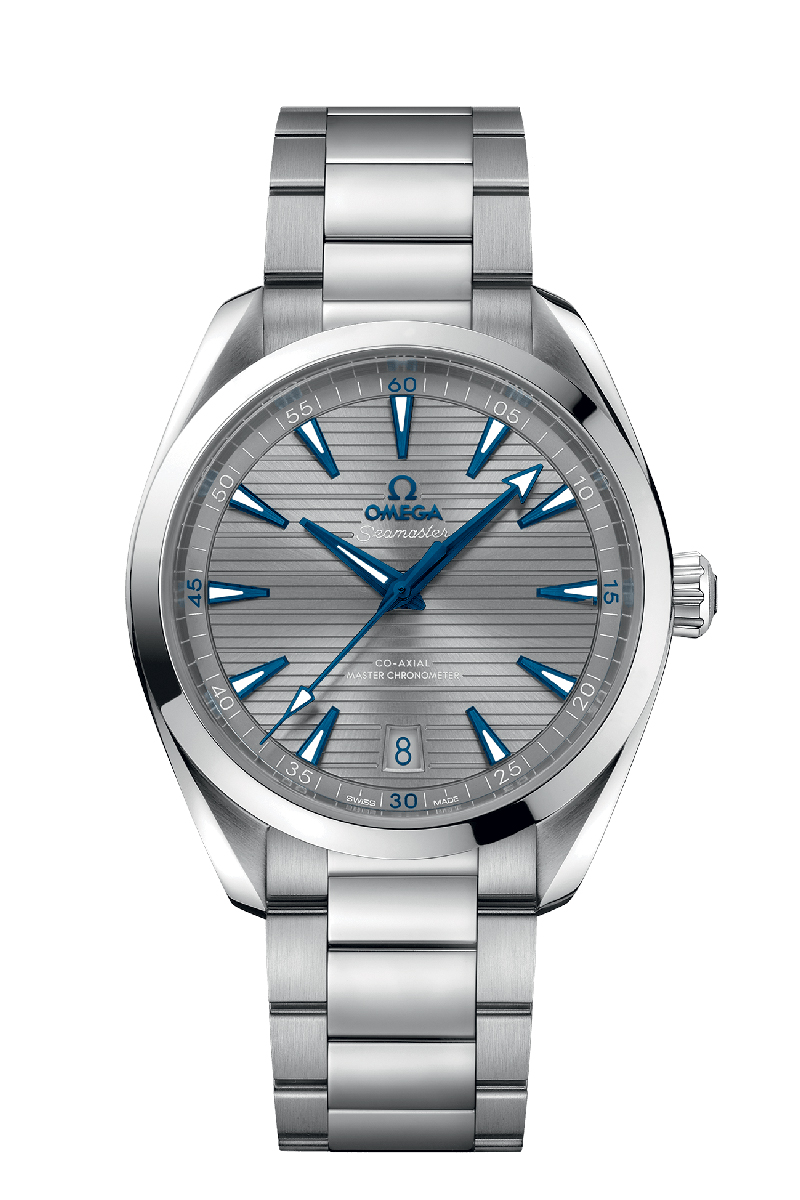 El Seamaster Aqua Terra es un magnífico tributo al abundante legado marino de OMEGA. En este modelo de 41 mm, la caja simétrica es de acero noble, con un diseño de ondas que bordea el fondo. La esfera gris destaca por un motivo “teak” horizontal inspirado en las cubiertas de madera de los veleros de lujo. Tiene también ventana de fecha situada a las 6 e índices y agujas azulados y rellenos de Super-LumiNova blanco. Presentado con un brazalete pulido y cepillado, este cronómetro certificado incorpora el calibre OMEGA Master Chronometer 8900 y está dotado de la certificación de nivel más alto del sector, que otorga el Swiss Federal Institute of Metrology (METAS).
