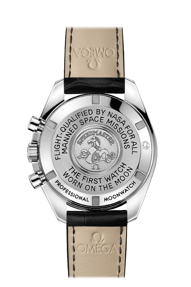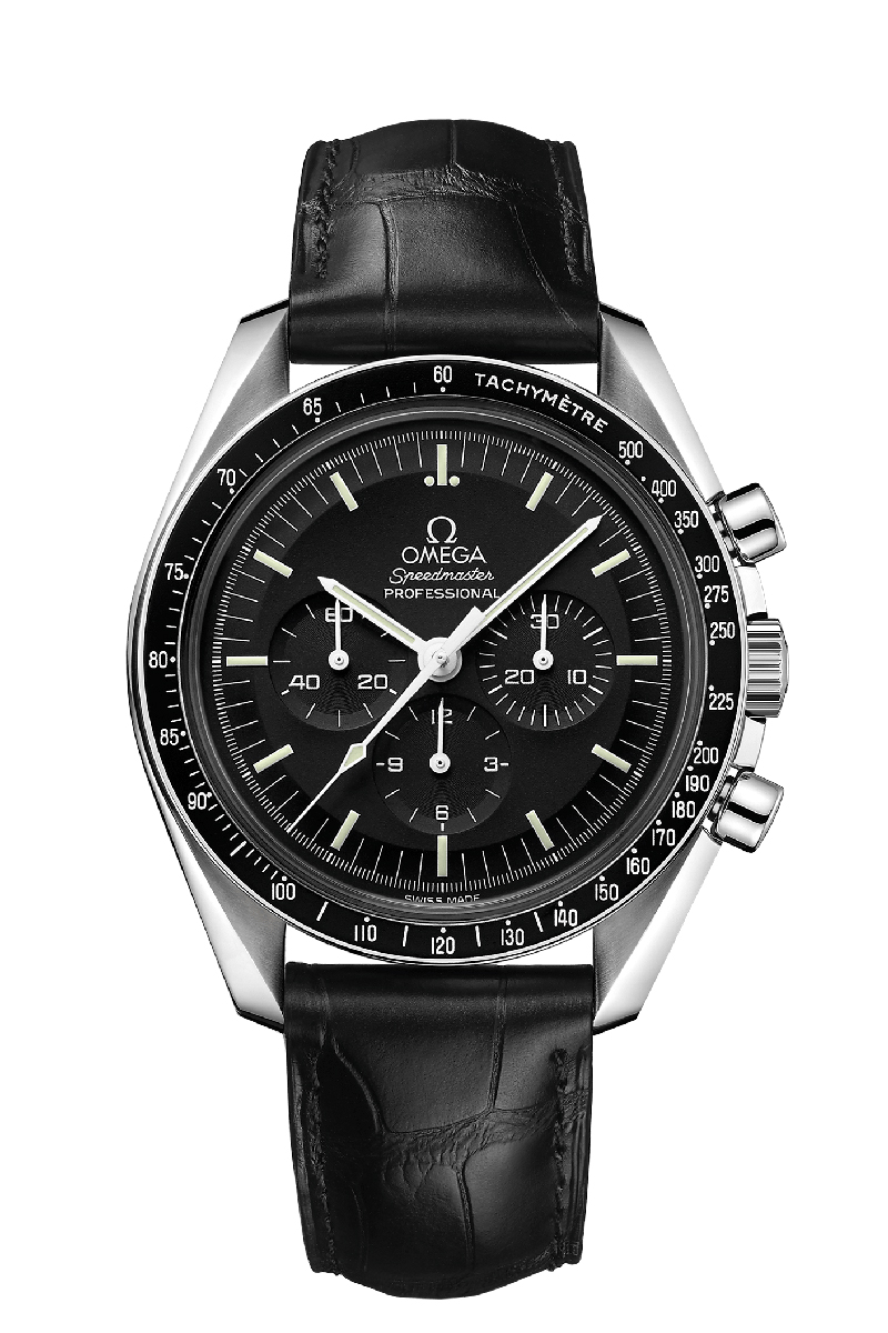 OMEGA Speedmaster es uno de los guardatiempos más icónicos de OMEGA. Participante en las seis misiones lunares, el legendario Speedmaster es una impresionante representación del audaz espíritu pionero de la firma. Este OMEGA Speedmaster Professional “Moonwatch” luce una esfera negra protegida por un cristal hesalite, con pequeño segundero, un contador de 30 minutos y otro de 12 horas, junto con un segundero central de cronógrafo. El bisel negro, con escala taquimétrica, está montado en una caja de 42 mm y acero noble, con pulsera de piel negra. Este cronógrafo incorpora el movimiento mecánico calibre 1861 de OMEGA, un descendiente del legendario movimiento de carga manual utilizado en la Luna. El reloj se presenta en un estuche especial Moonwatch que contiene una pulsera “NATO”, una pulsera para astronautas, una herramienta para cambiar pulsera o brazalete y un libro en que se narran las aventuras del Speedmaster.