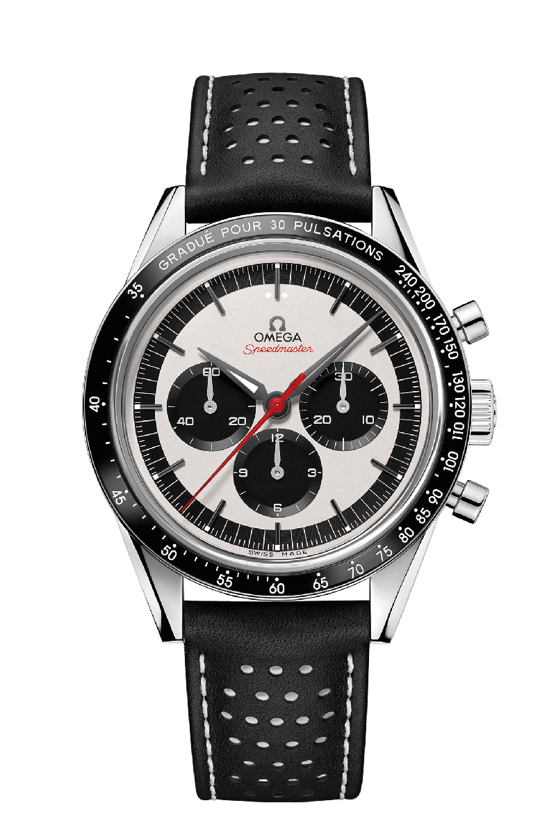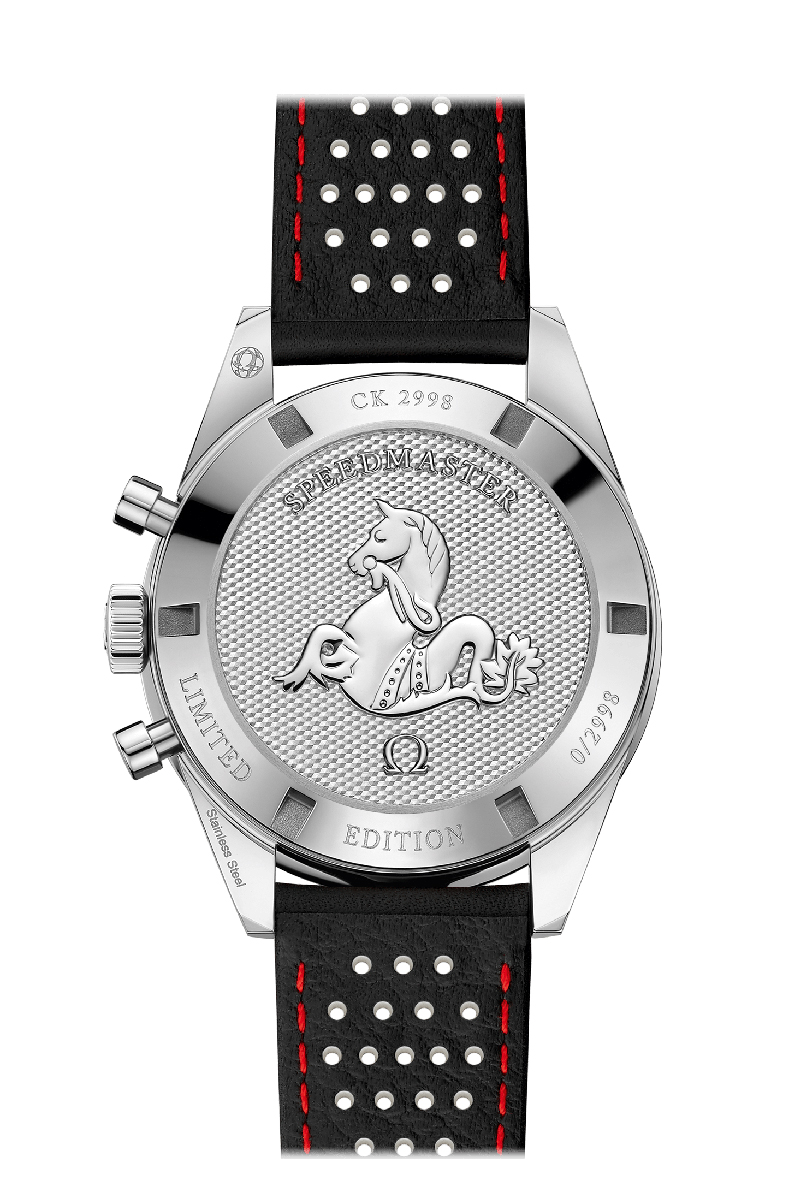 El OMEGA CK 2998 original se lanzó en 1959 y, desde entonces, se ha convertido en uno de los Speedmaster mas emblemáticos del mundo. Hoy, aquel modelo clásico ha servido de inspiración para este reloj. La caja de acero noble luce una esfera plateada tratada ligeramente con chorro de arena, una escala de minutos negra y un segundero de cronógrafo rojo barnizado, además de índices ennegrecidos y agujas horarias también ennegrecidas y revestidas con Super-LumiNova. Las tres subesferas negras incluyen agujas rodiadas tratadas con chorro de arena. El bisel cerámico negro lleva una escala de pulsómetro esmaltada en blanco y el reloj se presenta con pulsera de piel negra microperforada cuyo interior es de caucho blanco. Estos relojes incorporan el famoso calibre OMEGA 1861 y se han producido en una serie limitada a 2998 ejemplares. El número de Edición Limitada se encuentra en el fondo de caja, junto con el medallón Hipocampo original.
