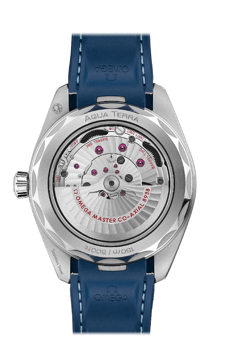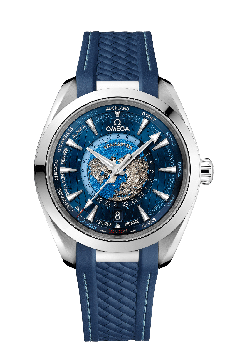 Este modelo Worldtimer de 43 mm incluye una caja en acero noble pulido que se integra con la pulsera de caucho estructurado azul por medio de un eslabón macizo pulido. La sección exterior de la esfera es azul cepillada e incluye bandas de teca verticales y un círculo de destinos mundiales impresos en rojo (GMT), plateado (+1 h en verano) y azul (lugares sin horario de verano). El centro de la esfera contiene un anillo de 24 horas en cristal: el azul claro indica las horas del día y el azul oscuro, las de la noche. La imagen de la Tierra está realizada en una placa de titanio grado 5. Ha sido recortada por láser para crear el océano azul y dejar un relieve de los continentes. Los contrastados colores de la superficie terrestre se han obtenido naturalmente por la reacción química del láser. El Worldtimer incorpora el movimiento Master Chronometer calibre 8938.