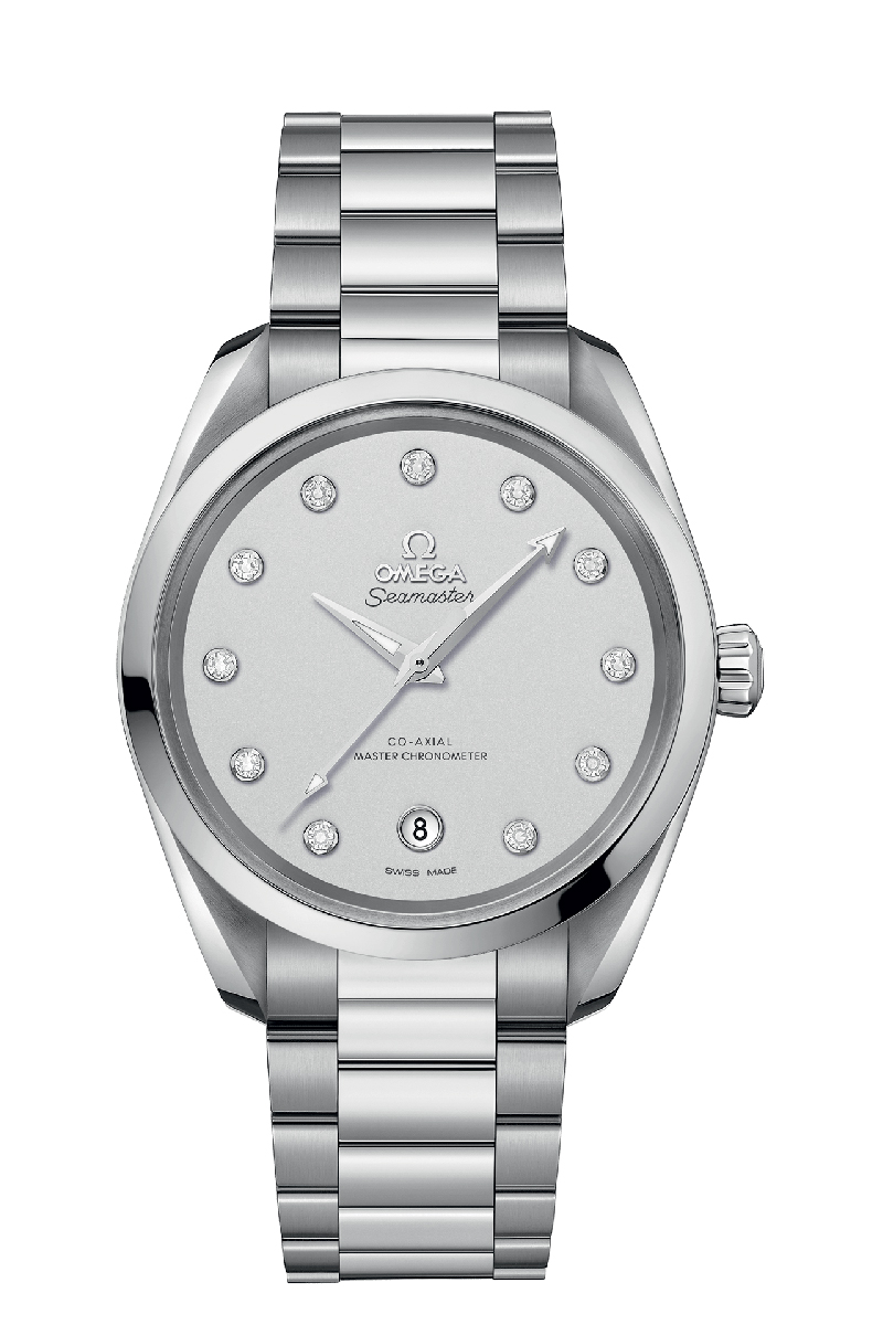 Rodeado de diamantes, el Seamaster Aqua Terra femenino es la auténtica definición de la elegancia. Con una caja simétrica de 38 mm, este modelo en acero noble luce una esfera plateada opalina con ventana de fecha situada a las 6 y, como índices, 11 diamantes embutidos en engastes rodiados. El reloj se presenta con brazalete integrado en acero noble. Dotado del calibre OMEGA Co-Axial Master Chronometer 8800, este reloj de pulsera cuenta con el certificado de nivel más alto del sector, otorgado por el Swiss Federal Institute of Metrology (METAS).