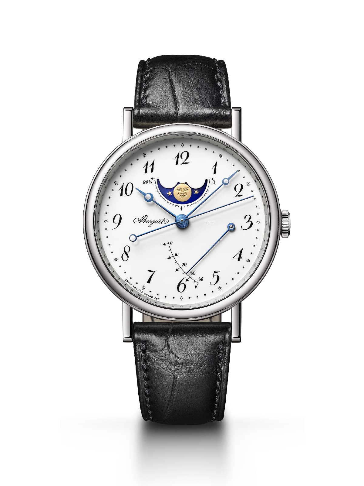 Caja de oro blanco de 18 quilates con el canto finamente acanalado. Fondo de zafiro. Diámetro 39 mm. Esfera de esmalte grand feu. Indicación de fases y edad de la luna. Indicación de la reserva de marcha. Movimiento mecánico de carga automática, cal. 591DRL. Reserva de marcha de 38 horas. Escape de áncora suizo en línea de silicio. Espiral de silicio. Frecuencia 4 Hz. Disponible también en oro rosa. Disponible también con esfera de oro con baño de plata.