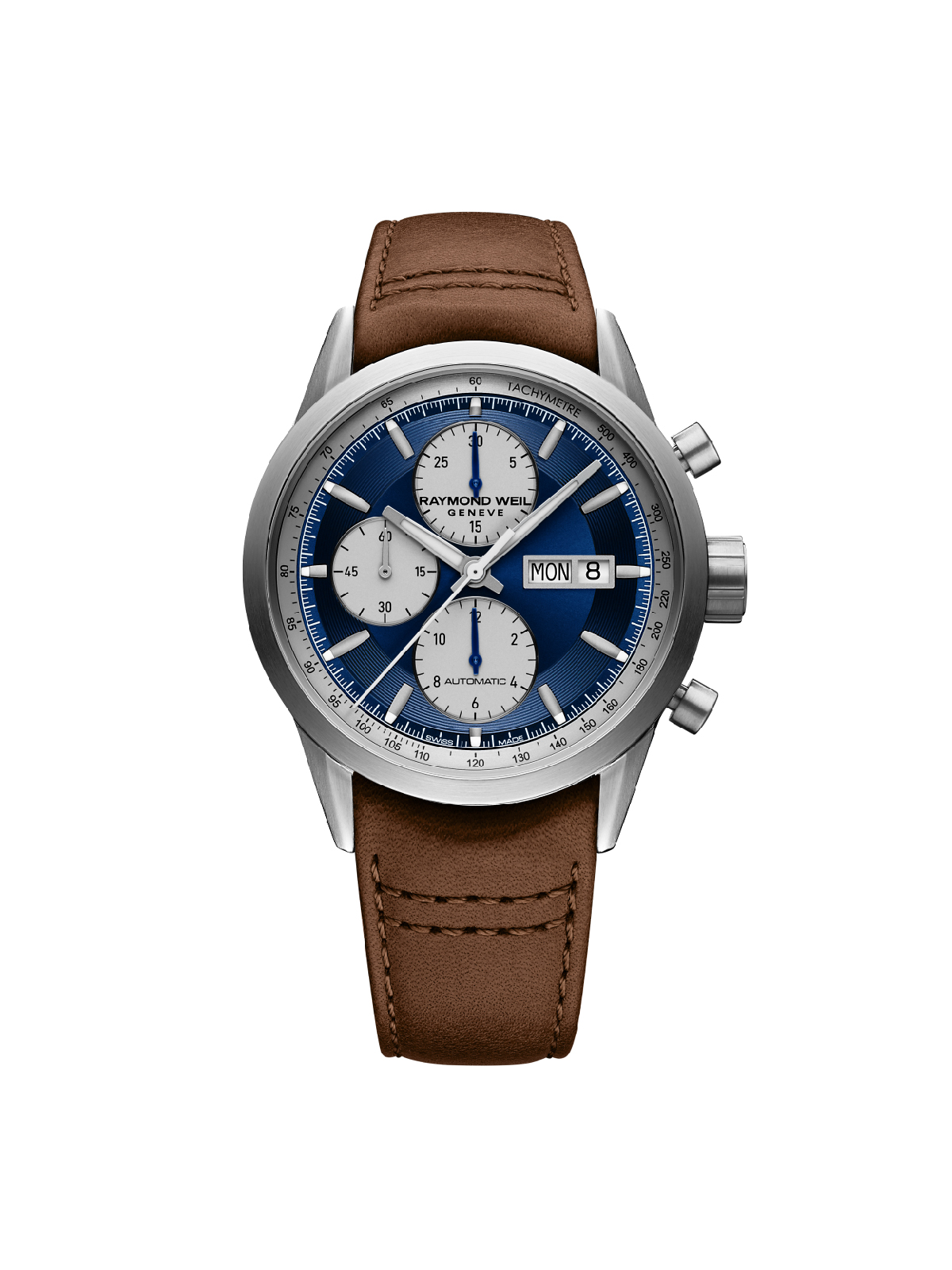 Ubicado en una caja redonda de acero inoxidable de color titanio de 42 mm, este nuevo cronógrafo independiente de inspiración vintage ofrece una ventana de fecha del día a las 3 en punto y una escala taquimétrica circular. La esfera cepillada en satén azul profundo contrasta con los tres contadores del cronógrafo beige y se completa con índices niquelados prominentes que combinan perfectamente con las manecillas delgadas. Las manecillas e índices recubiertos de Super-LumiNova® permiten una lectura completa en la oscuridad. La esfera está protegida por un cristal de zafiro con revestimiento antirreflectante que proporciona la máxima durabilidad y visibilidad. Este autónomo de cuerda automática para hombre cuenta con el movimiento cronógrafo Calibre RW5200. Tiene una reserva de marcha de 48 horas y late a una frecuencia de 28.800 vibraciones por hora.