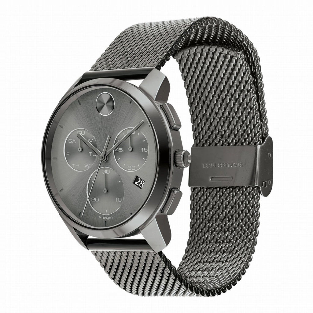 Movado BOLD Thin, caja de acero inoxidable con baño de iones grises de 42 mm con esfera de cronógrafo gris con un brazalete mesh de acero inoxidable con baño de iones gris. Cristal K1, movimiento de cuarzo suizo, resistente al agua hasta 30 metros.
