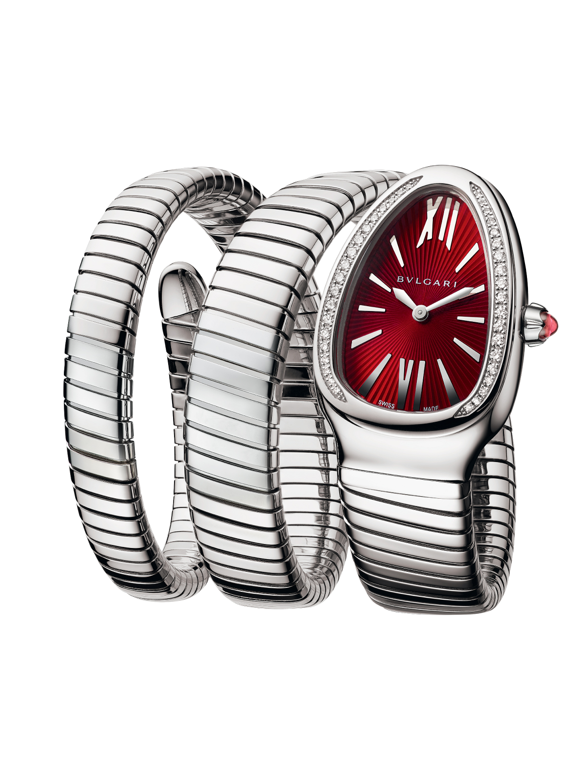 Material Corona en acero inoxidable con cabujón de rubelita rosa engastado y esfera lacada en rojo con guilloché soleil.