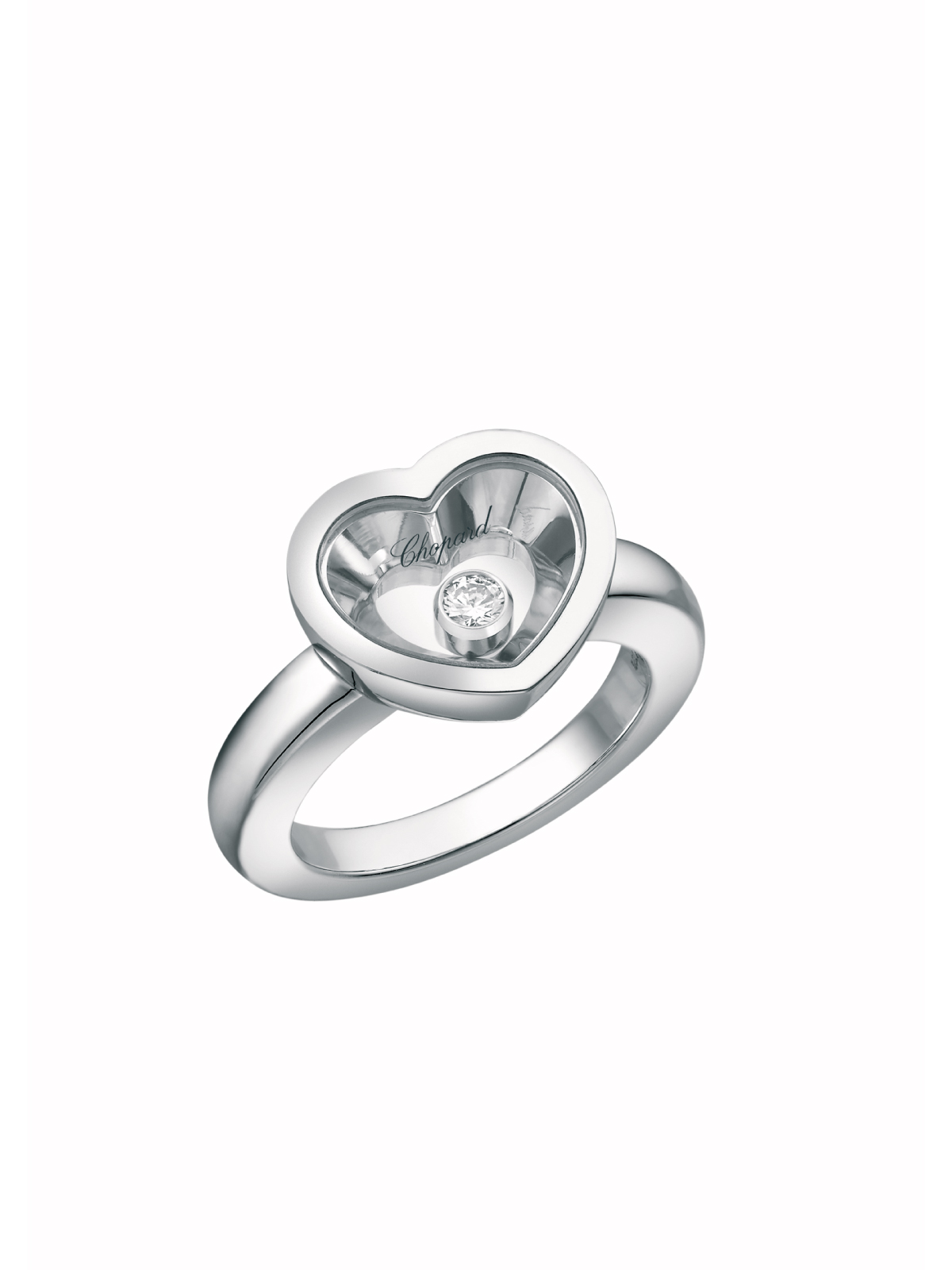 La colección de Very Chopard combina la hermosa feminidad de las delicadas curvas con un aspecto indiscutiblemente contemporáneo. Anidado dentro de esta sortija en forma de corazón de oro blanco de 18 quilates, el diamante móvil flota libremente entre dos cristales de zafiro. La inimitable forma cónica interior de la sortija aumenta su volumen y realza el juego de luces que crea el extraordinario